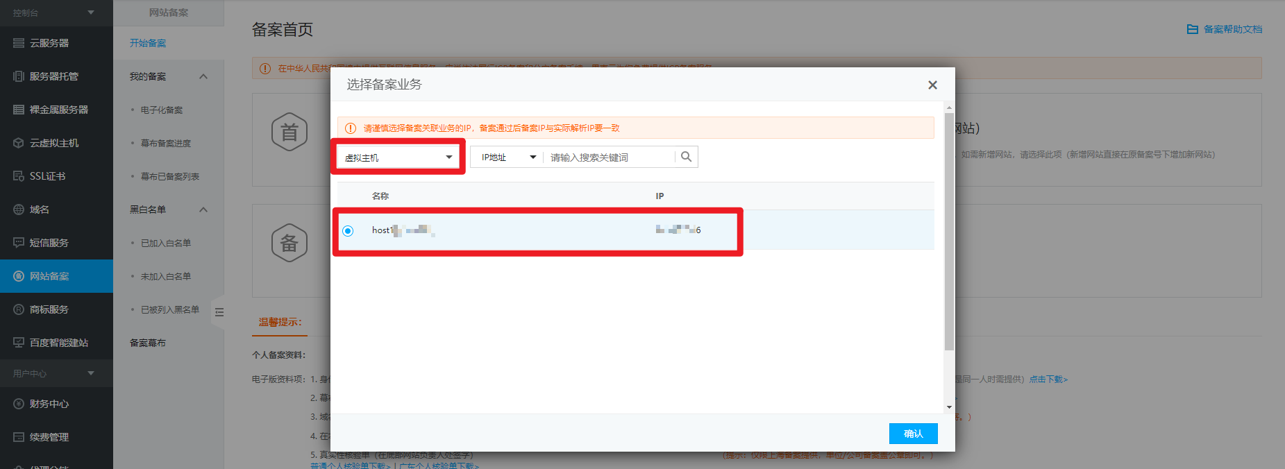 一、【电子化备案】 1、登录官网控制台,如已支持电子化备案,则点击电子化备案、选择备案IP 2、选择业务类型、业务IP,点击确认