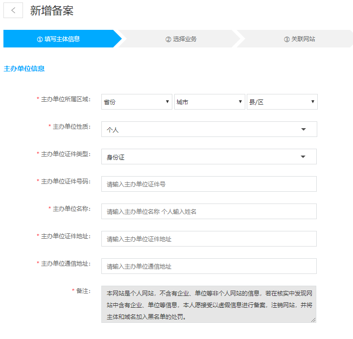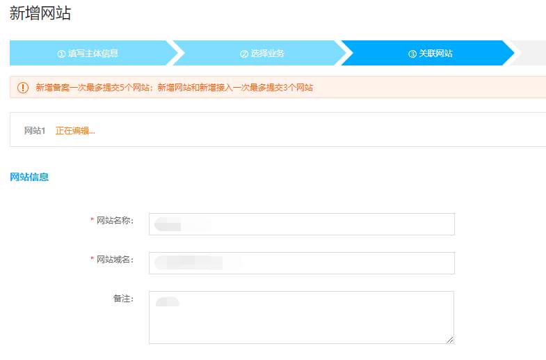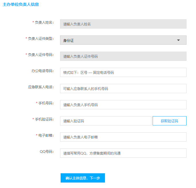 3、选择业务 4、填写网站的信息 如企业或单位备案,网站负责人的信息,如果直接是法人作为网站负责人,则可以勾选同主体负责人的信息;如果网站负责人不是法人,填写网站负责人的信息即可 填写好网站的信息,可以点击“确认网站信息,下一步”;如果需要同时备案多个网站,可以进行点击文字“保存并继续添加网站信息”,重复操作填写网站信息页面即可 5、上传相应的附件资料