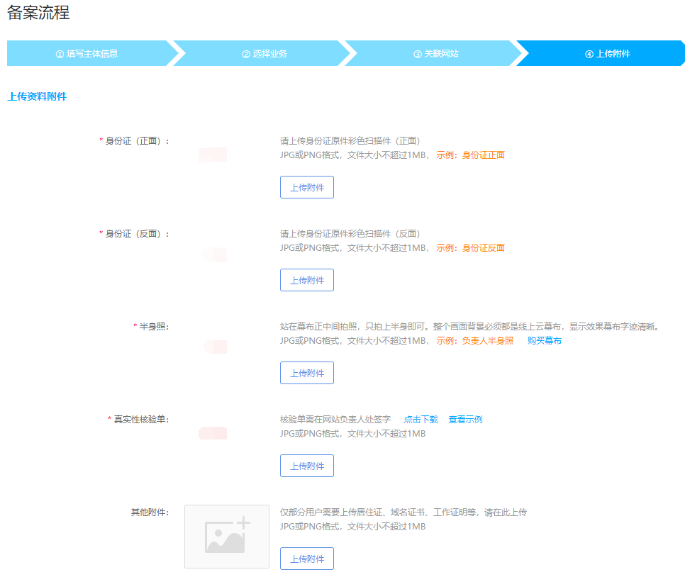 按照备案所需的电子版资料上传备案资料,每个省份的要求会有所不同,详细要求请阅览各省份备案规则 企业备案:附件中必须上传的备案附件有5个,分别为: ①主体单位有效证件(营业执照彩色扫描件,不能是黑白复印件) ②主体负责人有效证件(法人的身份证正反面彩色扫描件) ③网站负责人证件(网站负责人的身份证正反面彩色扫描件) ④网站负责人真实性核验照片(站于幕布正中间,拍上半身即可,显示效果幕布字迹清晰) ⑤网站备案真实性核验单彩色扫描件(核验单必须网站负责人处签字并盖企业公章) 个人备案:附件中必须上传的附件有2个,分别为: ①主体单位有效证件(备案人身份证正反面扫描件) ②网站负责人真实性核验照片(提供腰部以上不可戴帽子或眼镜,双手垂立的幕布半身照) 域名证书(仅限江苏、湖南、陕西、福建、新疆、吉林、云南、上海省份备案提供,其他地区可不提供) 上传完整所有的附件资料,选择“确认附件信息,下一步”;如果网站信息还需要进行修改,则可以进行选择“上一步”,修改网站信息